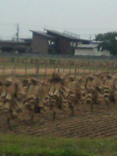 集団で稲を刈って、稲ぐいにかけ終えると