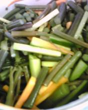 胡瓜、を細く切ります。生姜醤油で浅漬け