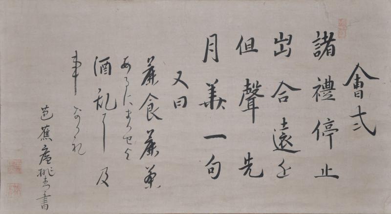 〔解 読〕 会式印( 不耐?)諸禮停止出合遠近但 聲 先月華一句 又曰 麁食麁茶 あるにまかせよ 酒乱に及 事なかれ 芭蕉庵桃青書 印 印( 芭蕉・桃青)