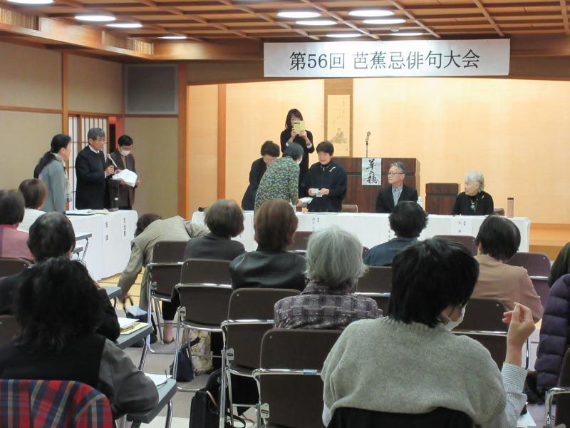 10月26日、芭蕉の命日10月12日(新暦)にちなみ第56回芭蕉忌俳句大会が開催されました。開会に先立ち、選者による献句が行われ、和やかな雰囲気の中、成功裡に終了しました。