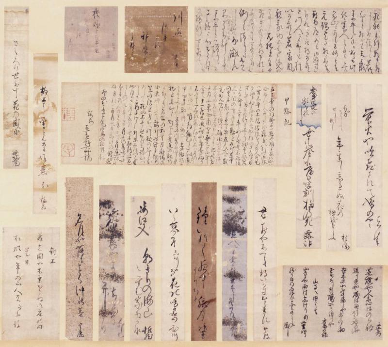 芭蕉が門人去きょら い 来にあてた書簡、蕉門の重鎮森川許六の「甲路記」、蕉門俳人や芭蕉にゆかりの俳人の発句二十二句の色紙・短冊が貼り交ぜられた一軸である。去来の門流に伝来したものと考えられている。