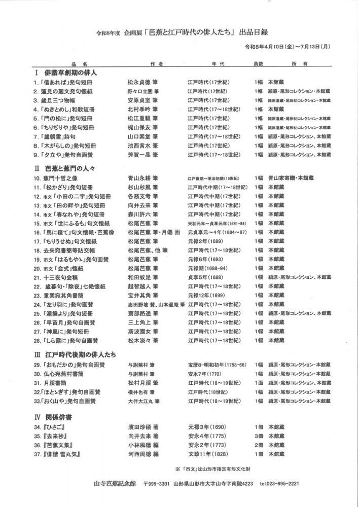 企画展「芭蕉と江戸時代の俳人たち」の出品目録