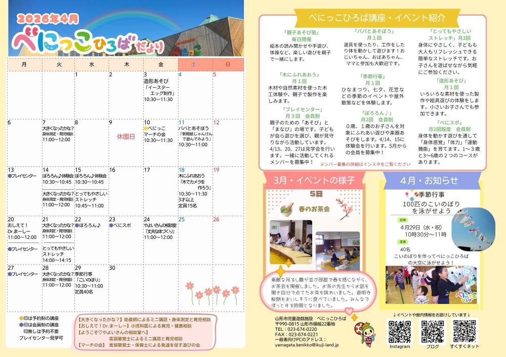 暖かい陽気となってきました。楽しいべにっこひろばの講座やイベントの紹介があります。ぜひご覧ください。今月もべにっこひろばで、元気いっぱい遊んでくださいね♪