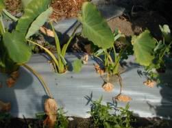 グリーンプロシートで育った葉はその大きさも違います。里芋も香り豊で味も良いのです。もちろん無農薬栽培です!