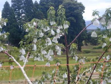 シートを使用していない通常の桃畑です。袋掛けをしています。