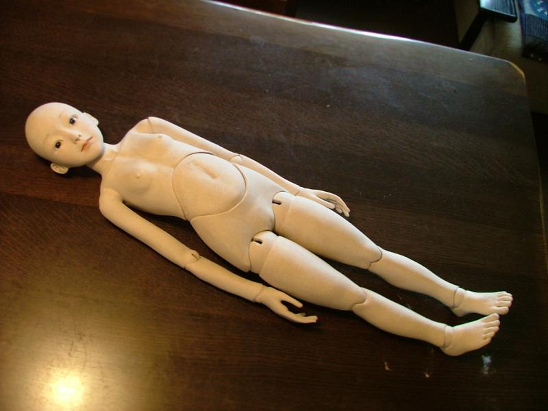 頭、手、足にピアノ線のフックを付け、ゴムを通して合体する。立つ、座るなどのポーズをさせてみて不具合がないか観る。