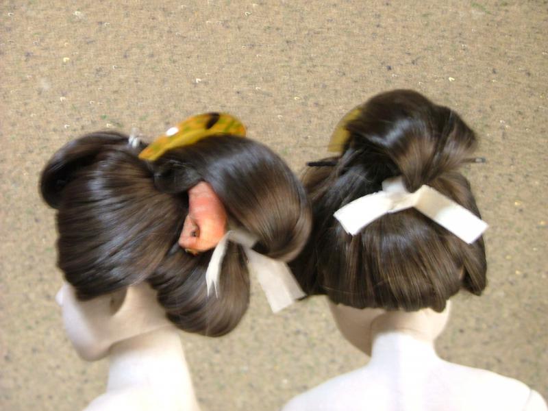 貼りつけた髪を結う。この人形の場合は江戸時代後期の下級武士の妻たちとしての時代考証にて結い上げました。日本髪の歴史についての書を数点紐解いてみましたが、下級武士の妻の髪型について詳しく載っているものがなかなかありませんでした。ただ、町人たちと髪型そのものはあまり変わらないということと、華美にならないように心がけて結い上げてみました。(丸髷を基本にしてみました。)