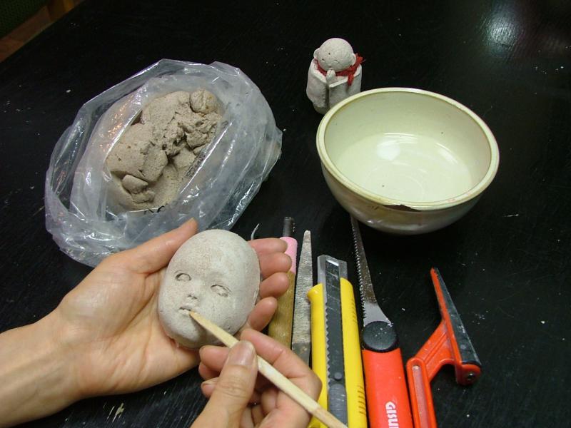 初心者の方は、球体関節人形ではなく、簡単な抱き人形の制作になります。始めは粘土に慣れていただくために、地蔵様を作りますが、子どもの粘土遊び的な感触に、すっかり無口になっていらっしゃいます。そして、ポツンと「無我の境地っていいね」と至福の時を過ごされています。