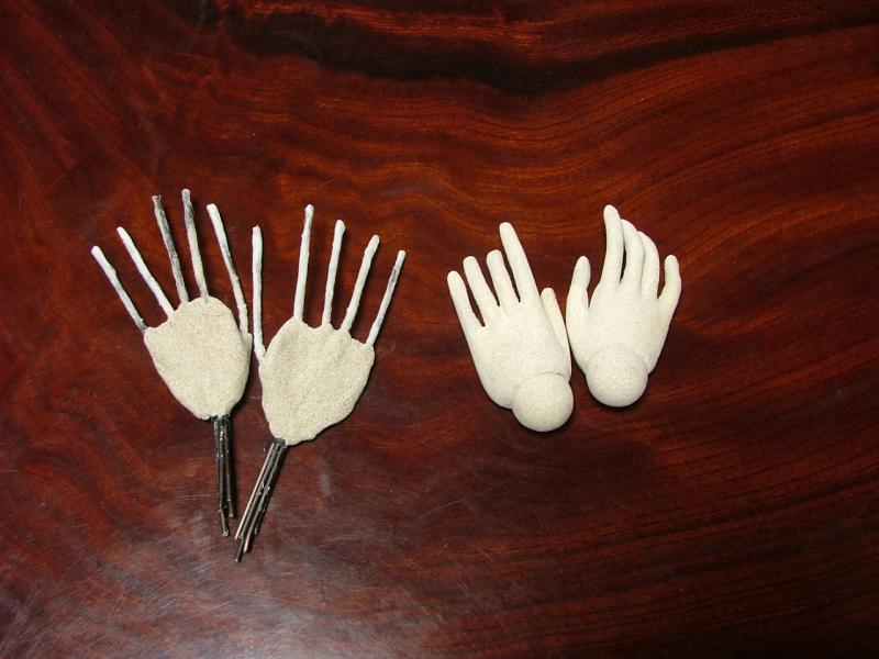 ワイヤーに綿を薄く巻いて5本づつに縛り、掌の箇所を粘土で固定して乾かし、粘土を何回か重ねて表情を作っていく。