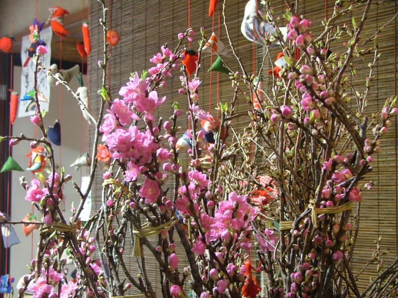 ブログ記事でつるし雛を観た友が、つるし雛には桜が似合うと言って、河津桜ならずとも似たような桃の花と彼岸桜をいっぱい送ってきました。店先においた途端に目白が一羽飛んできました。雛と桜と目白は初春にはよくよく似合っていい風情です。自然とのコラボレーションによる室礼です。