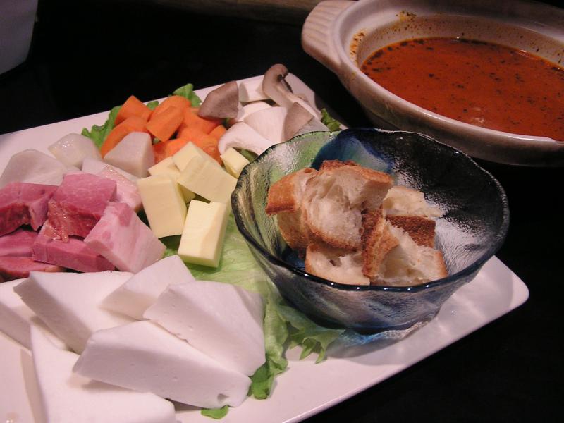 ベーコン・チーズなどさまざまな具材を鉄串にさし鍋でホンデュ(笑)、最後はおいしくパクリと食べてください!!