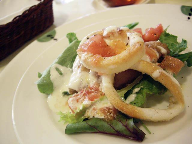 お魚と上にのっけたイカとサラダが