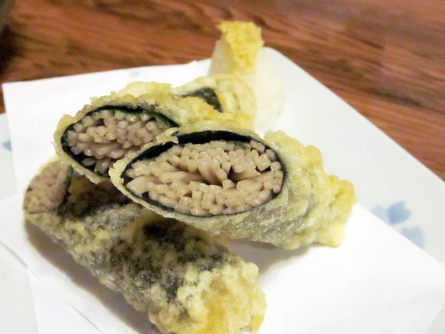蕎麦を海苔で巻いている斬新なお料理ですね。