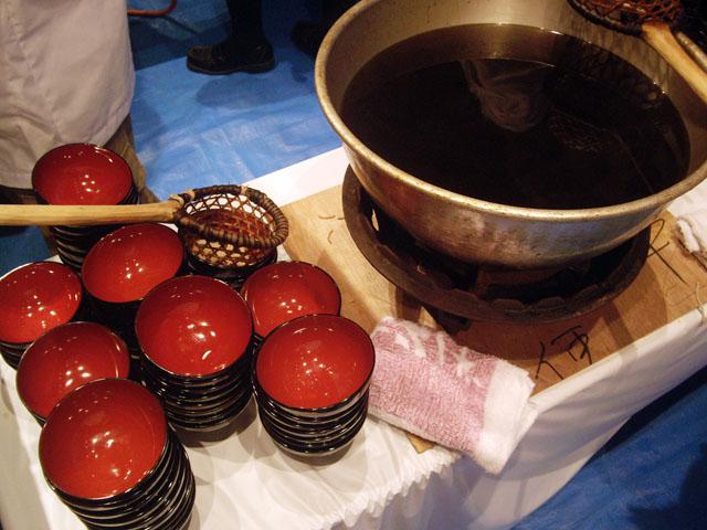目の前には、重ねて並べられている「小さなおわん」と「そばつゆの大鍋」。