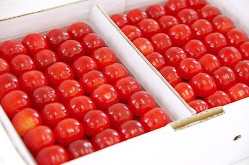 収穫されたさくらんぼの中から大きく赤い実が選別されます。それを匠の技で次々と並べていきます。選び抜かれたさくらんぼは見て美しく、食しておいしい逸品です。