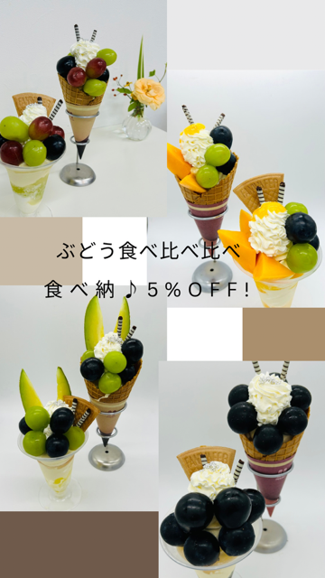 ぶどう食べ比べもそろそろ食べ納め♪そこで【11月30日・12月1日はぶどう食べ比べパフェ各種を5%OFF】皮ごと食べられて種なしの大粒ぶどう●ナガノパープル●クイーンルージュ●シャインマスカットをどうぞお楽しみください。ご来店をお待ちしております。