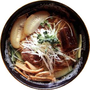 和風のすっきりスープに泳ぐ細めの自家製麺には、厳選した小麦粉とアルカリイオン水を使用。八丁味噌と焼酎でコトコト煮込んだ牛スジ+牛スネをのっけて、食べ応えは満点!