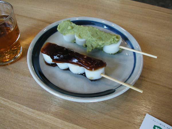 萬寿屋さんのお団子です。手前がみたらし、奥の緑色がじんだん(枝豆)です。