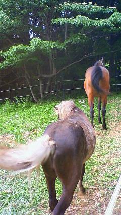 最近ちょっと脚の調子の悪い馬がいてみんなより一足先に、緑の放牧地初デビュー。