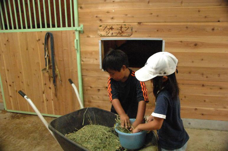 キャンプ中の担当の馬の餌やり、馬小屋の掃除は