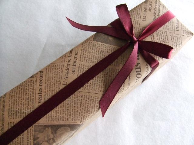 英字新聞のような包装紙で包んで、ワインカラーのリボンを結んで仕上げました!