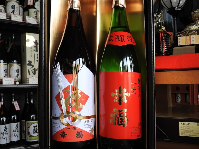 「一生幸福 お祝い2本セット」本当に いい名前のお酒ですよね!結納のお祝いに! 結婚のお祝いに! 新築のお祝いに!大変好評で、ご注文いただいております。お店に並べても、真っ赤なラベル、紅白のラベルが華やかですごく目立ちます! お酒には豪華な金箔入りなんですよ。華やかなので、結納のお席のお土産にお持ちになる方も多く大変好評です。また、結婚のお祝いにプレゼントされる方も多く、「一生幸福」という名前にプレゼントされる側も、大変喜ばれているそうです♪