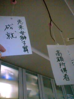 おっとぉぉ〜!こちらには「恵来母獅子舞成就」と書いてあります。そうです!精進あるのみ!・・・その横には・・「高額所得」のえげつない欲望のたんざくが・・・っ。まったくお恥ずかしい限りであります。っちゅーか!!普通団子の木にも願い事かいたりするものデスカ?これは我が家だけの風習ですか?その願い事は毎年毎年貪欲になっているような気がする・・・最初は交通安全とか家内安全とかの(とっても大事です)短冊だったのに。この頃はより具体的になっております。下のチビは「犬を買えますように」と書いてました。へへへ「買える」けど「飼えない」のだよ。(ヒドイ!)受験を控えた息子は合格祈願の祈願を最初は間違って「折願」と書いておった・・・あららら