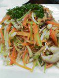 これが美味い!!線野菜のうす塩和えです。にんじん、セロリ、絹さや、生しいたけ、もどした高野豆腐をすべて千切りにして10秒ほどゆで冷水にとり水気を取って千切りにした長ネギ(白髪ねぎ)しょうがを加えて砂糖、塩、コショウ、ごま油、酒で和えます。とてもしゃきしゃきした歯ごたえでセロリの癖もなく野菜たっぷり食べられますよぉっ♪ぜひ作ってみて下さい!ただ切るだけの手間しらずですわ