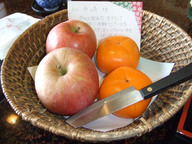 部屋のテーブルには○○様へとメッセージカードと果物が。ここいう心配りのサービスが心憎いですねーっ 旅館というには近代化されており和装ホテルという感じ?