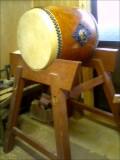はるばる県外に出張して、えくぼの為に太鼓を仕入れてきました。中古ですがね。というのも稽古のときにイチイチ師匠が重たい太鼓を運ばなくてはならない苦痛から解放されたかったダケなんです。この太鼓見ててなんか物足りませんよね?そうです。太鼓の皮にあるいつもの黒の三つ巴が無いからです。胴も綺麗に塗りなおしてお色直ししますから。