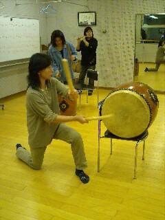横叩きの基本は崩さずに膝をついて叩いてみました。今頃皆様、肩の筋肉痛で湿布薬はってるかもね?