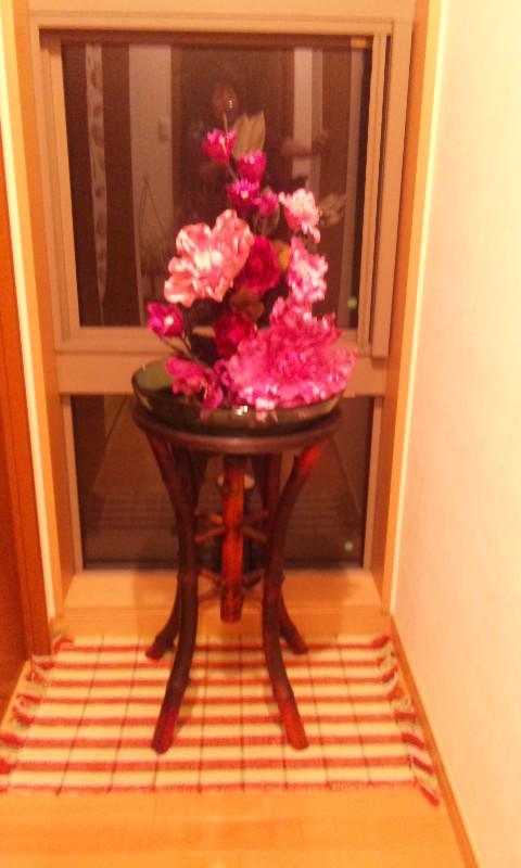 たまたま入ったカフェに素敵な雑貨も売り物として置いていて、セールになっていたので去年衝動買いした花器?です。籐製ですが器が緑のガラスなんです。ホームセンターで買った布製フラワーを飾ってみました。我が家で浮いてる場所かも?