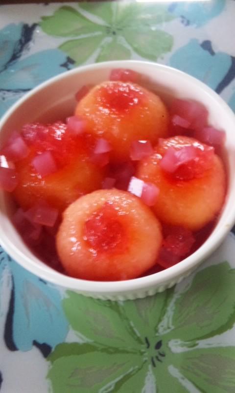 これはお砂糖で煮ただけのりんご丸煮です。赤い煮汁にゼラチンを入れてお化粧してあげました♪半分は粉寒天で固めてさいの目に切ってのせてます♪