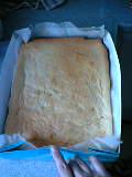 四角にスポンジを焼きました〜!!・・・実はこの焼き型はお酒(4合瓶2ケ)が入っていた化粧箱なのでーす。もうオープンいっぱいいっぱい!!ターンテーブルはもちろん回転できずに苦しそうでしたよ・・。こんな箱に入れてケーキを焼くなんて自分でもすごいと思う・・・。さぁこれがどんなケーキに変身するのかお楽しみに〜♪
