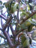 これ「金の成る木」です。なんと凍みてしまったのです!葉も落ちて力ない様子です。なぜ故にこんな縁起のいいネーミングをいただいたのかわかりませんが、枯らしてしまうとなると嫌な気分ですよー!似たような名前で「幸福の木」っていうのもご存知かと思いますが、そういう名前のついた植物は得てして丈夫で育てやすいとお聞きしておりますが・・・。まずい〜!このまま枯れてしまっては!せっかく「高額所得者」を目ざしていたのに・・・・!どーりでこの頃出費がかさむと思っておりました。(結局自分が原因のくせに) 何とか毎日金の成る木に話しかけて