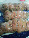 鶏の胸肉に砂糖、塩、お好きなハープをすりこみジッパーにいれて空気を抜いて冷蔵庫に一晩から二晩寝かせます。タコ糸を巻いてサランラップで肉をぐるっとキャンディー包みしてから水を入れた無水鍋に入れて75度で40分で出来上がりです。この75度というのがミソらしいです。旨みを逃がさずしっとりとした柔らさに仕上がりますよ♪(HIのコンロですと温度と時間設定できます。) これはまだ加熱する前です。・・・そこのあなた!?誰かを想像しましたね?