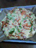 一見ピザに見えますが・・・実はピザ風の餅なのです♪フライパンにオーブンシートを敷いて切り餅を半分の薄さにして並べて蓋をして弱火で焼きます。暫くすると隣り同士の餅が柔らかくなりくっついてきたらピザを作る要領でて具材を載せて再び蓋をして焼きます。もちっとしてトローり、あつあつを召し上がれっ♪