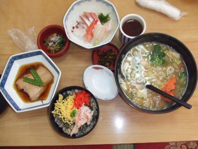 えー・・・まずは新潟、寺泊港のお魚市場の二階の食堂で最初の腹ごしらえ♪さすがは新鮮魚介類!!!これはワタクシが注文したカニ飯定食です。お刺身、煮魚、そしてカニとお魚のアラが入った晩屋汁。おいしかったぁ