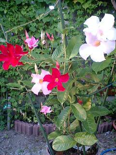 マンデビラという花です。玄関で写真を撮っておりましたら通りがかった車を停車させ知らないご婦人が「なんていう名前の花ですか?」わざわざ聞きに車から降りていらっしゃいました。よほど花がお好きなんですね