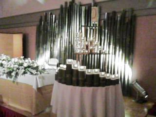 ごらんの写真は私の古い携帯電話のものなのであまりしっかり写っていませんが、高砂の背景やテーブルのキャンドル、また入場口などにふんだんに竹をあしらっていて、凛とした空間は個性ゆたかな「晴れの場」になっていました。