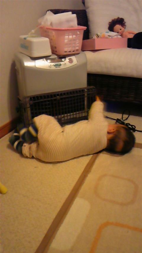 なんて、寝返りしながらゴロゴロしていて、ストーブに行き当たり、触り心地や足での感触が面白かったみたいで蹴ったり手でいじったりしていますf^_^;