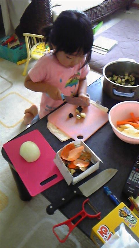 今夜はカレーライスです。カエデに野菜を切るのを手伝ってもらいました。