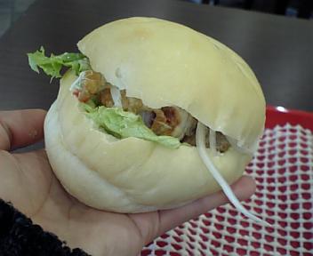 パンにタコ焼きがゴロッと二個(?)挟んであって、さらに『こんにく』も一枚挟んであるので、食べ応えは満点o(><)oあっさり味に、ねぎのピリ辛しゃきしゃきがいいアクセント☆