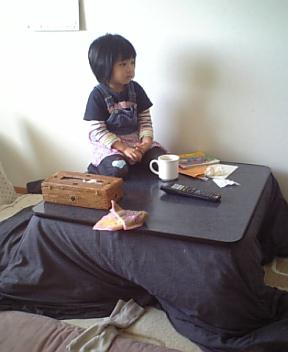 テーブルの上に正座してテレビを見るカエデ(´〜`;)
