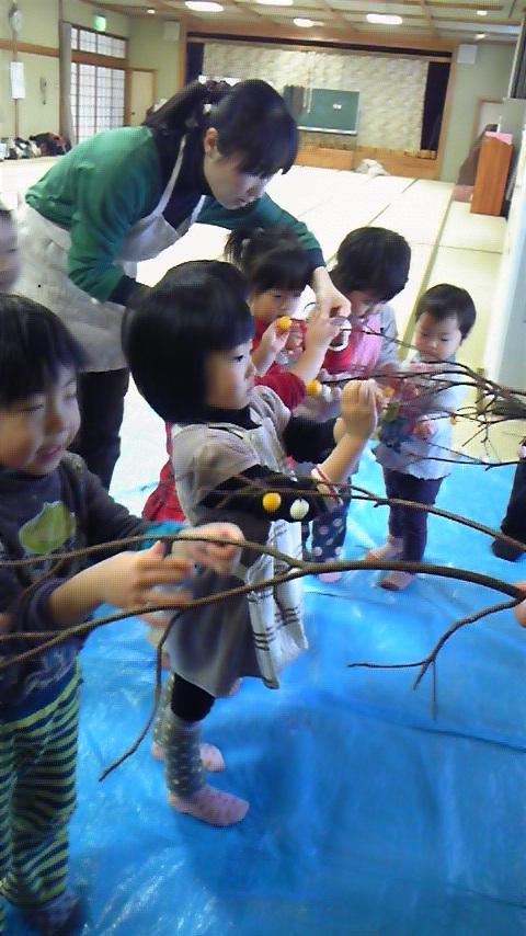 みずきの木の芽かきをし、四色の団子をつくり、飾り付けをしました。