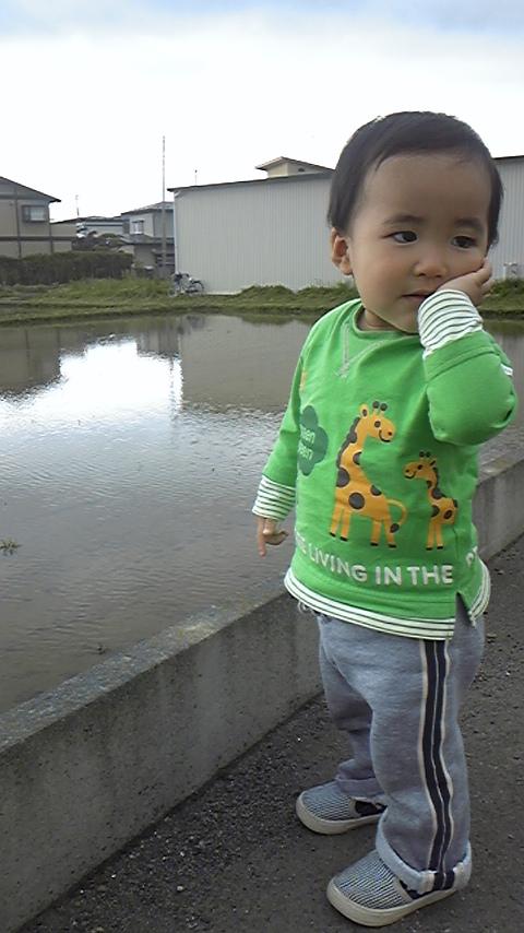 アパートの前の田んぼに水が入って、ソラはそれが気になる様子。