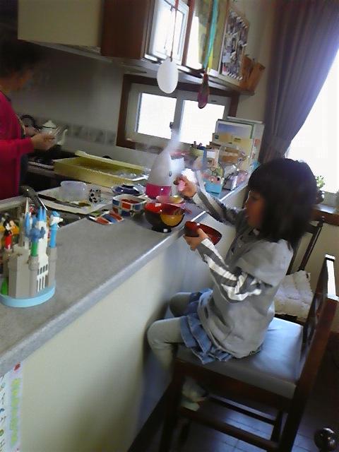 頑張ってやってきて、かなりお腹が空いていたようで、おやつを食べても食べ足りず、ばあばんちのキッチンのカウンターでわんこそばを食べはじめた楓さんでした(笑)