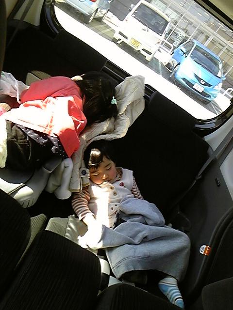 お父ちゃんお休みなので、幼稚園迎えに行ってお出かけしてきたのに、子供達三人とも車で寝てしもうた。。