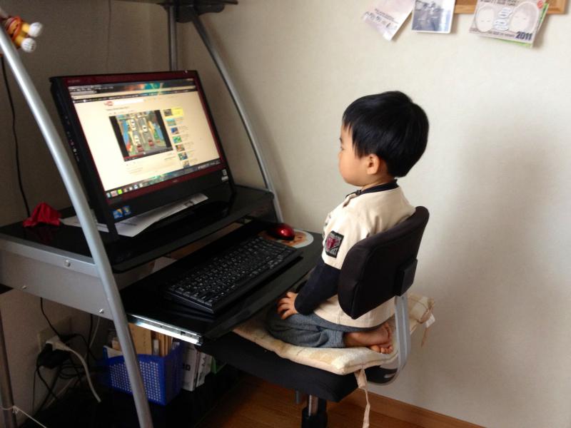 パソコン画面から十分な距離をとり、美しい姿勢でYouTubeを見るソラ。