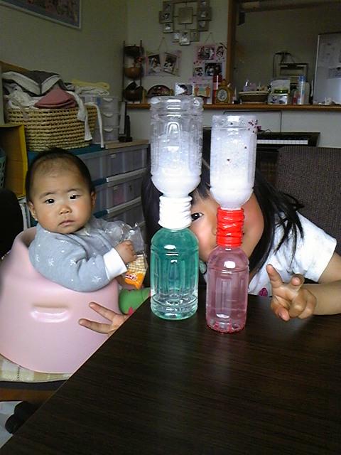 ペットボトルの中に水のりと色水を合わせたものと、キラキラのスパンコールなどが入れてあり、水が落ちるのと一緒にキラキラします☆